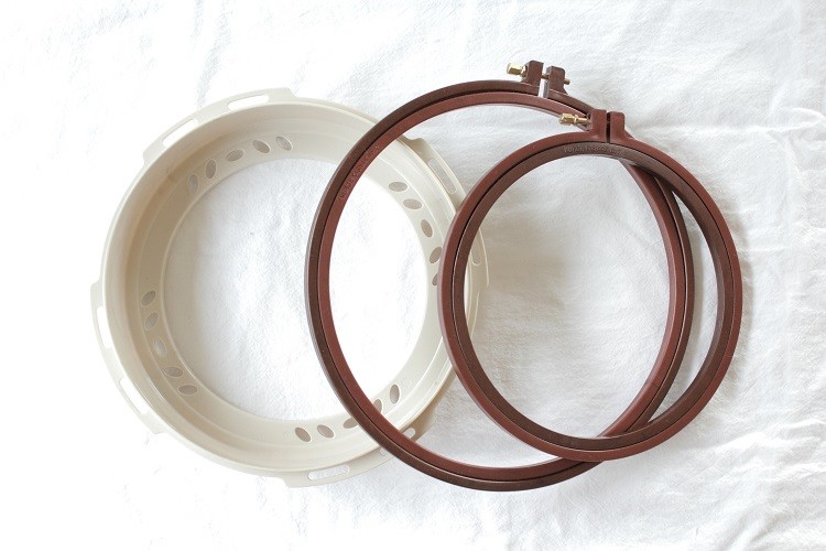 Plastic Embroidery stand(24.5cm x 5.2cm) + Plastic hoop (17.7cm) + Plastic hoop (22.8 cm) + Mini driver